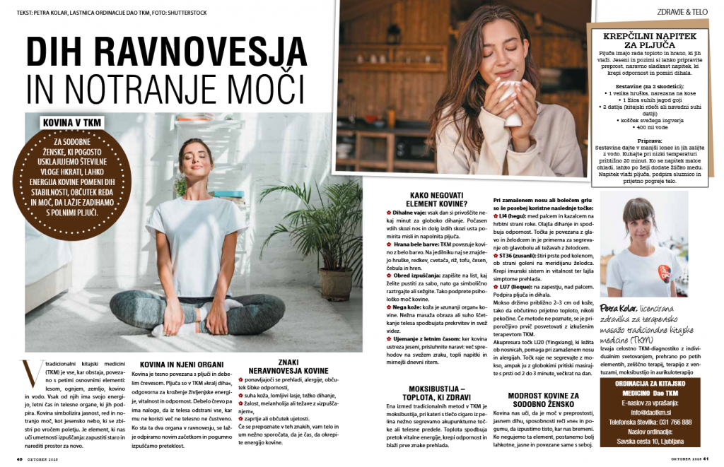 V tradicionalni kitajski medicini (TKM) je vse, kar obstaja, povezano s petimi osnovnimi elementi: lesom, ognjem, zemljo, kovino in vodo. Vsak od njih ima svojo energijo, letni čas in telesne organe, ki jih podpira. Kovina simbolizira jasnost, red in notranjo moč, kot jesensko nebo, ki se zbistri po vročem poletju. Je element, ki nas uči umetnosti izpuščanja: zapustiti staro in narediti prostor za novo.